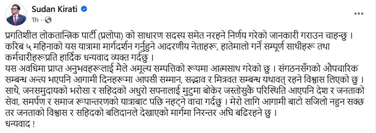 पूर्वमन्त्री सुदन किरातीले प्रगतिशील लोकतान्त्रिक पार्टी (प्रलोपा)सँग आफ्नो सम्पूर्ण औपचारिक सम्बन्ध अन्त्य गरेको घोषणा गरेका छन् । यसअघि अध्यक्ष परिषद् सदस्य पदबाट राजीनामा दिएका उनले अब पार्टीको साधारण सदस्यसमेत नरहने निर्णय सार्वजनिक गरेका हुन्।