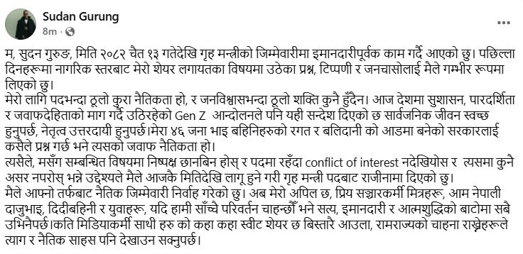 गृहमन्त्री सुधन गुरुङले पदबाट राजीनामा दिएका छन् । विवादित व्यवसायीसँग विभिन्न सेयर कारोबारमा मुछिएको आरोप लागेका गुरुङले प्रधानमन्त्री बालेन्द्र शाह (बालेन) लाई राजीनामा बुझाएका हुन् ।