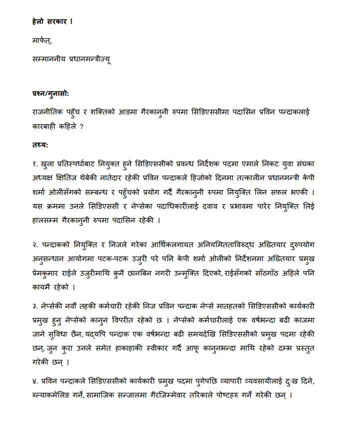 उजुरीकर्ताले खुला प्रतिस्पर्धाबाट नियुक्त हुने सिडिएससीको प्रवन्ध निर्देशक पदमा एमाले निकट युवा संघका अध्यक्ष क्षितिज थेबेकी नातेदार रहेकी प्रविन पन्दाकले हिजोको दिनमा तत्कालीन प्रधानमन्त्री केपी शर्मा ओलीसँगको सम्बन्ध र पहुँचको प्रयोग गर्दै गैरकानुनी रुपमा नियुक्ति लिन सफल भएको आरोप लगाएको छ साथै यस क्रममा उनले सिडिएससी र नेप्सेका पदाधिकारीलाई दवाव र प्रभावमा पारेर नियुक्ति लिई हालसम्म गैरकानुनी रुपमा पदमा रहेको उजुरीमा उल्लेख गरेको छ ।