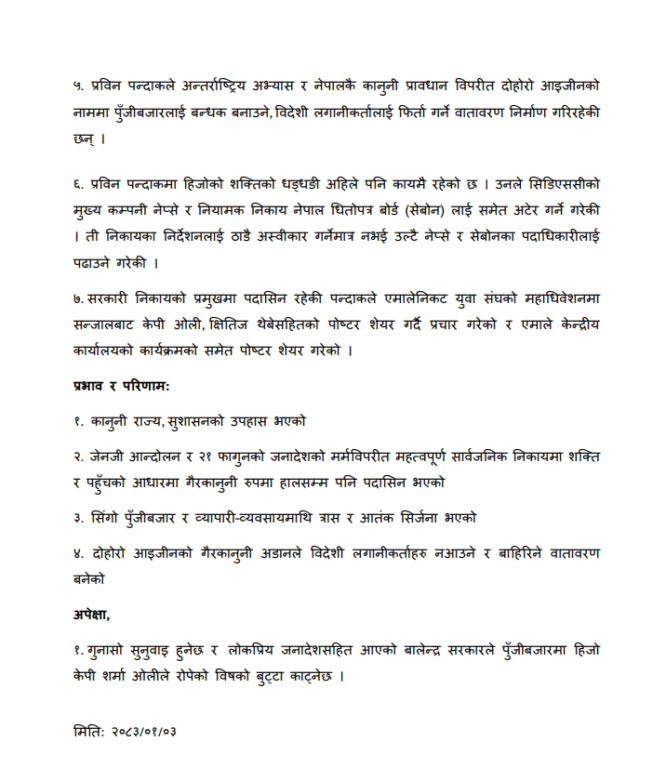 सत्ताको शक्तिको कारण गैरकानुनी रुपमा सीडीएस एण्ड क्लियरिङ लिमिटेड (सीडीएससी) को प्रमुख बनेको भन्दै प्रविन पन्दाकालाई कारबाही गर्न माग गर्दै उजुरी परेको छ । हेलो सरकारमार्फत् प्रधानमन्त्री बालेन्द्र शाहलाई पत्र लेख्दै गैरकानुनी नियुक्ति लिएको आरोपमा पन्दाकलाई कारबाही गर्न उजुरीकर्ताले माग समेत गरेको छ ।