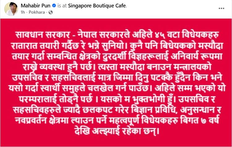 स्वतन्त्र सांसद एवं आविष्कारक महावीर पुनले सरकारले बनाउन लागेका नयाँ विधेयकहरूको मस्यौदा प्रक्रियालाई लिएर कडा टिप्पणी गरेका छन्। सामाजिक सञ्जालमा आफ्ना धारणा राख्दै उनले ४५ वटा विधेयकहरू रातारात तयार भइरहेको भन्दै सरकारलाई 'सावधान' गराएका हुन्।