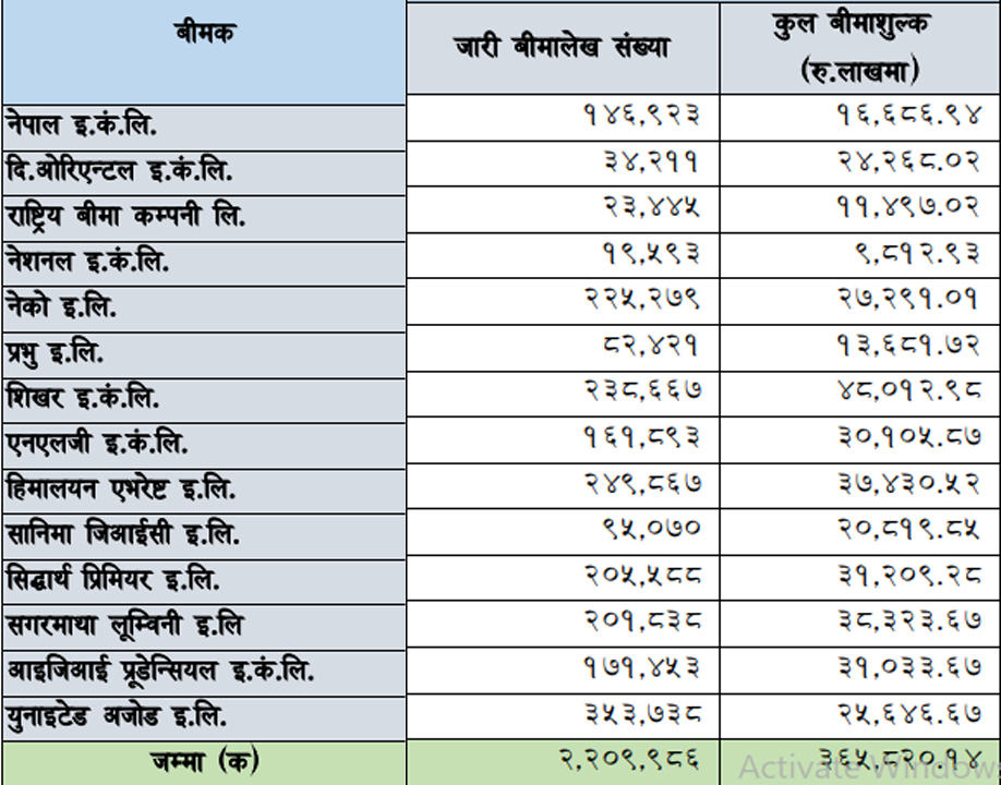 प्राधिकरणको तथ्यांक अनुसार चैत मसान्तसम्ममा शिखर इन्स्योरेन्स ४ अर्ब ८० करोड १२ लाख ९८ हजार रुपैयाँको व्यापार गरेको छ । यो अवधिमा शिखरले २ लाख ३८ हजार ६ सय ६७ वटा बीमालेख जारी गरेको छ । त्यस्तै धेरै व्यवसाय गर्नेको दोस्रो नम्बरमा रहेको सगरमाथा लुम्बिनी इन्स्योरेन्सले ३ अर्ब ८३ करोड २३ लाख ६७ हजार रुपैयाँको व्यवसाय गरेको छ । सगरमाथा लुम्बिनीले यो अवधिसम्ममा २ लाख १ हजार ८३८ बीमालेख जारी गरेको छ । व्यापारको आधारको हिसाबले हिमालयन एभरेष्ट इन्स्योरेन्स तेस्रो स्थानमा छ । यो कम्पनीले चालु आर्थिक वर्षको चैत मसान्तसम्ममा ३ अर्ब ७४ करोड ३० लाख ५२ हजार रुपैयाँ बीमाशुल्क संकलन गरेको छ । यो कम्पनीले यो अवधिसम्ममा कुल २ लाख ४९ हजार ८६७ वटा बीमालेख जारी गरेर उक्त रकमको व्यवसाय गर्न सफल भएको छ । यो अवधिमा बीमालेख संख्याका आधारमा भने युनाइटेड अजोड इन्स्योरेन्स सबैभन्दा अघि देखिएको छ । युनाइटेड अजोडले सबैभन्दा धेरै ३ लाख ५३ हजार ७ सय ३८ वटा पोलिसी बिक्री गरेको छ । यो कम्पनीले सबै भन्दा धेरै बीमालेख जारी गरे पनि कुल २ अर्ब ५६ करोड ४६ लाख ६७ हजार रुपैयाँ मात्र व्यवसाय गरेको छ ।