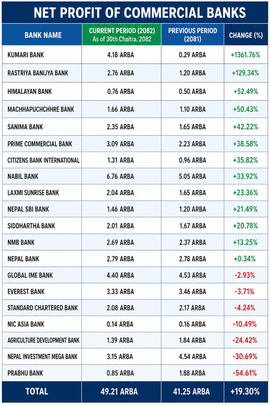 कुमारी बैंकको नाफा १३५१ प्रतिशतले बढेर ४ अर्ब १७ करोड रुपैयाँ पुगेको छ। एभरेष्ट बैंकको नाफा ३.७१ प्रतिशत घटेर ३ अर्ब ३२ करोड रुपैयाँमा झरेको छ भने नेपाल इन्भेष्टमेन्ट मेगा बैंकको नाफा ३०.६९ प्रतिशत घट्दै ३ अर्ब १४ करोडमा सीमित भएको छ। अन्य बैंकहरूतर्फ हेर्दा प्राइम कमर्सियल बैंकको नाफा ३८.५८ प्रतिशतले बढेर ३ अर्ब ८ करोड, नेपाल बैंकको ०.३४ प्रतिशतले बढेर २ अर्ब ७९ करोड र राष्ट्रिय वाणिज्य बैंकको नाफा १२९.३४ प्रतिशतले बढेर २ अर्ब ७६ करोड पुगेको छ।