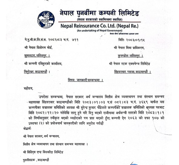 नेपाल पुनर्बीमा कम्पनीका सञ्चालक समिति अध्यक्ष सुरेन्द्र कुमार पौडेलले आफ्नो पदबाट राजीनामा दिएका छन्। उनले चैत २० गतेदेखि लागू हुनेगरी अध्यक्ष पद त्याग गरेका हुन्।