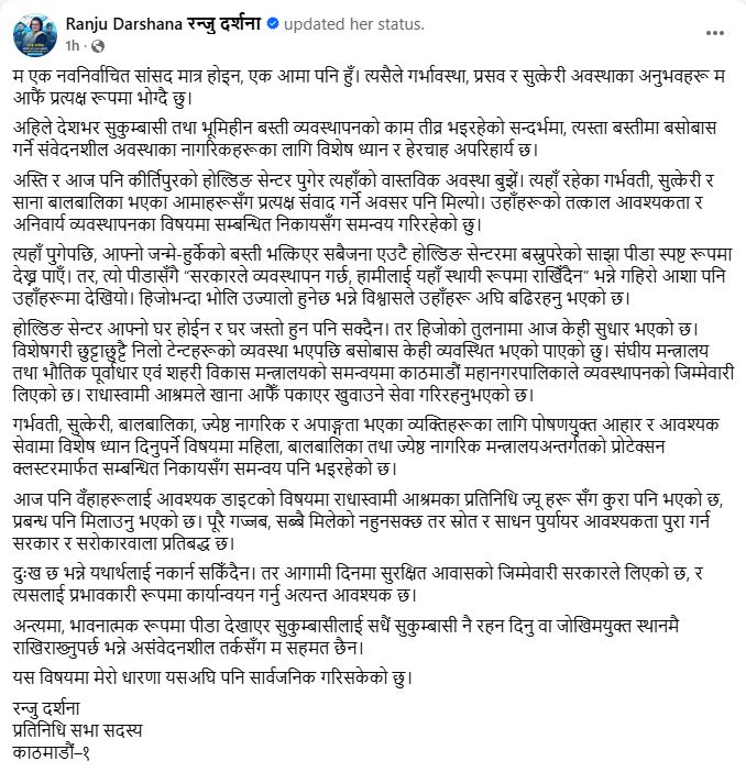 सत्तारुढ दल रास्वपाकी सांसद रन्जु दर्शनाले कीर्तिपुरस्थित होल्डिङ सेन्टरमा रहेका सुकुम्वासी तथा भूमिहीन नागरिकहरूको अवस्थाबारे स्थलगत अनुगमन गरेकी छन्। काठमाडौं क्षेत्र नं. १ बाट निर्वाचित सांसद दर्शनाले विशेषगरी त्यहाँ रहेका गर्भवती, सुत्केरी र साना बालबालिका भएका आमाहरूसँग प्रत्यक्ष संवाद गरी उनीहरूको समस्याबारे जानकारी लिएकी हुन्।
