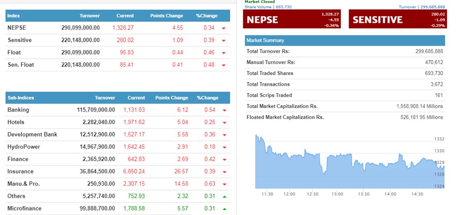 आज कारोवार मापक सूचक ४.५५ अंकले घटेर एक हजार ३२८.२७ अंकमा झरेको छ । आज कूल १६१ कम्पनीको शेयर रु २९ करोड ६३ लाखमा खरिद बिक्री भएको छ ।
